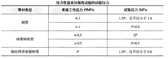 根据《消防给水及消火栓系统技术规范》第12.4.2条规定,压力管道水压强度试验的试验压力应符合下表规定: